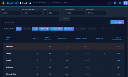 Mit einem Klick auf das Tabellensymbol wechseln Sie von der Kartenansicht in die Tabellenansicht. Hier werden alle Regionen des gewählten Landes übersichtlich aufgelistet – von der höchsten bis zur niedrigsten Blitzdichte sortierbar.