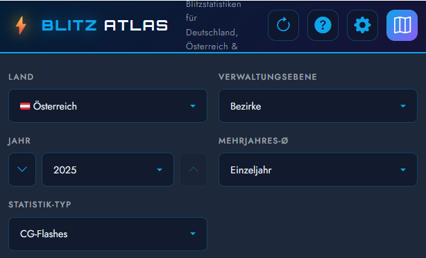 Der Blitzatlas ist ein interaktives Analysetool für Blitzstatistiken im gesamten DACH-Raum. Er basiert auf den präzisen Messdaten von ALDIS/BLIDS (Austrian Lightning Detection & Information System). Seit 1992 werden damit Cloud-to-Ground-Blitze lückenlos erfasst – der Blitzatlas macht diese umfangreiche Datenbasis seit 2016 für jedermann zugänglich und auswertbar.