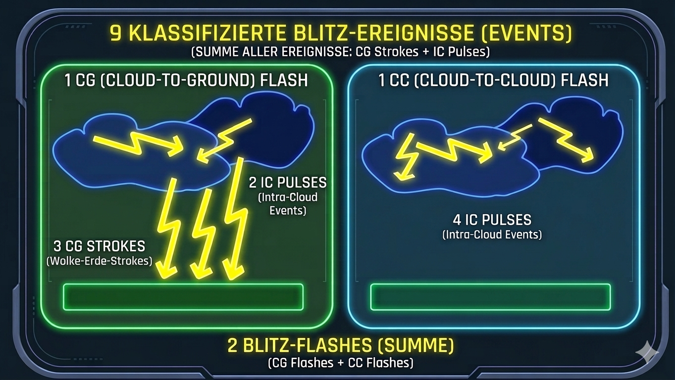 CG-Flashes (Blitze) sind die empfohlene Standardmessgröße. Ein CG-Flash gruppiert mehrere zeitlich nahe Teilentladungen zu einem einzigen Blitzereignis – das, was wir umgangssprachlich als „einen Blitz" bezeichnen. Nur CG-Flashes werden von ALDIS seit 1992 lückenlos erfasst und eignen sich daher für langfristige Vergleiche.