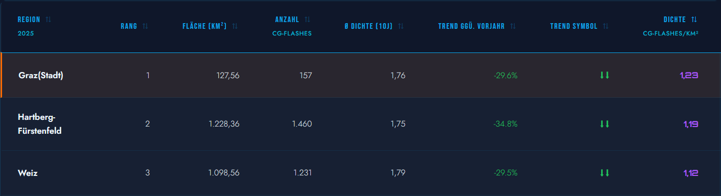 Neben der Karte steht eine vollwertige Tabellenansicht zur Verfügung. Per Klick auf eine Spaltenüberschrift lässt sich die Tabelle aufsteigend oder absteigend sortieren – ideal für das schnelle Auffinden der blitzreichsten oder ruhigsten Regionen.