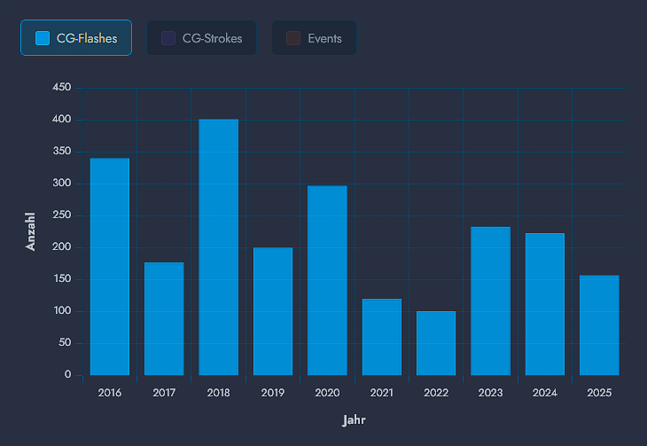- Statistiktyp: CG-Flashes (Standard), CG-Strokes (Teilblitze) oder Events (alle Entladungen inkl. Wolkenblitze). Bitte beachten Sie, dass nur CG-Flashes eine sinnvolle Aussage über die Blitzdichte ergeben. Mehr Infos dazu in der Hilfe im Blitzatlas